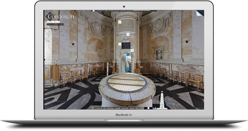 SITE PHARE DE CORDOUAN : visite virtuelle du phare actuel créé à partir de panoramique 360° et placement de directions ou de fiches explicatives sur le décor.